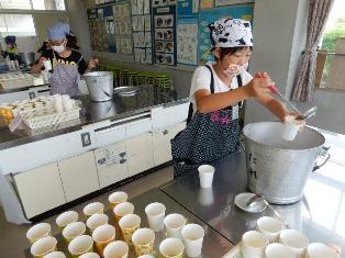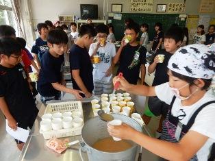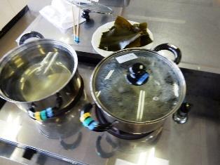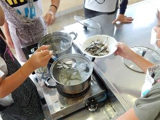 6年生は家庭科の授業で、①②③④の紙コップには、かつお、