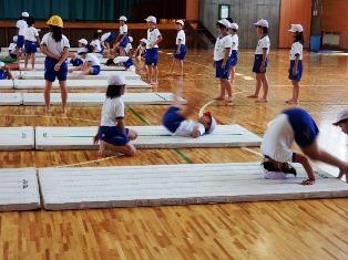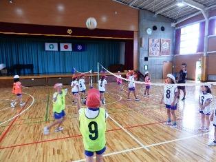 4年生は体育の授業で、体育館でバレーボール方の球技の練習です。