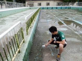 教育委員会から借用した放射線測定器でプールのヘドロ部分を