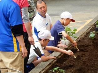 678組の教室前の花壇で野菜の植え付けをしている子どもたちです。
