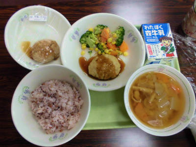 赤米しそごはん、牛乳、和風ハンバーグ、ブロッコリーのゴマ醤油和え、みそ汁