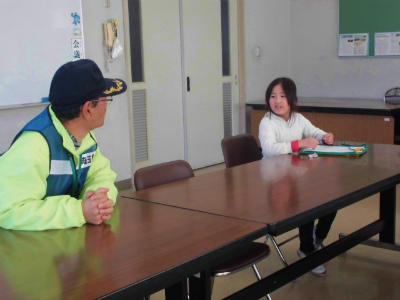 今回は、スクールガードリーダーに来校していただき、インタビューをしていました。