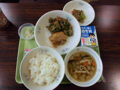 20日献立 ごはん、牛乳、とり肉の塩麹焼き、れんこんのきんぴら、ぬっぺ汁、そぼろ納豆
