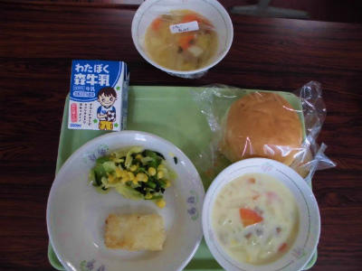 21日の献立 チーズパン、牛乳、いかの香味焼き、小松菜とコーンのサラダ、ホワイトシチュー、除去は、乳抜きのスープ