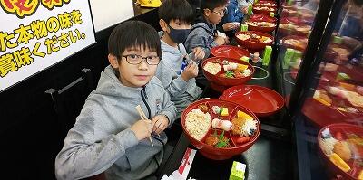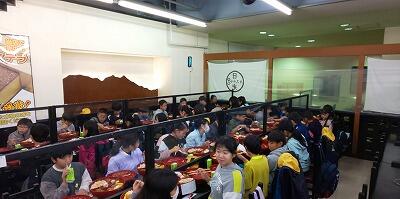 昼食は、向かい合うども立ちとの間にパーテーションが置かれ飛沫防止をしています。みんなおいしくいただきました。