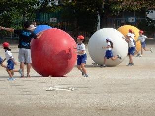 大玉転がしのリレーを行っているようです。