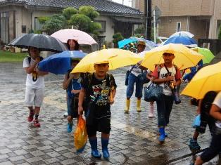 雨音に負けず、元気な声で、あいさつしている子どもたちです。