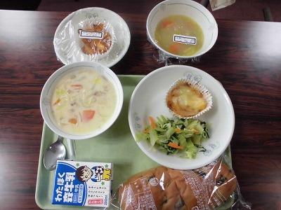 本日の給食は、ぶどうパン、牛乳、ポテトのピザソース焼き、水菜サラダ、白菜のシチューでした。ポテトのピザソースは、玉ねぎたっぷりでとてもおいしかったです。アレルギーは ポテトのピザソースと白菜のシチューでした。