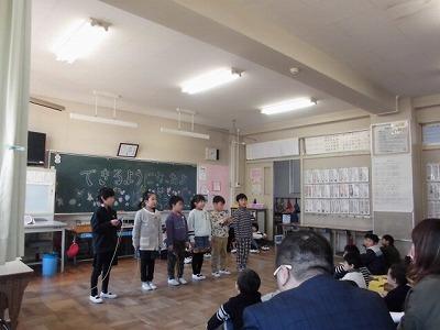 今日の5時間目は、1・2年678組が授業参観・懇談会でした。どのクラスもいろいろな発表会で、自分たちの1年間の成果を保護者の方々に披露しました。自分たちで構成やセリフを考え、何度も練習を重ね今日の本番に臨みました。いろんな工夫が見られ、保護者の皆様も微笑みながら一生懸命の子ども達を応援していました。