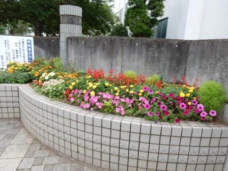 校門の花壇には、夏を代表する美しい花々が咲き、子どもたちを迎えています。