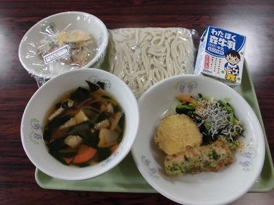 地粉うどん、牛乳、きつねうどん、天ぷら(さつまいも・竹輪)、青菜のごましょうゆ和えでした。うどんに天ぷらの組み合わせで、子どもたちはおいしくいただきました。