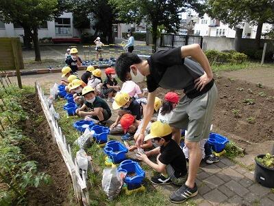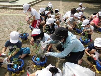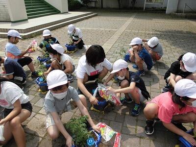 2年生は、学年のみんなでミニトマトを植えました。先生の丁寧な説明に耳を傾け、しっかりと植えることができました。