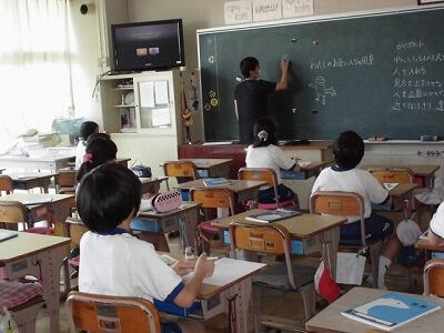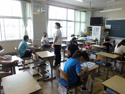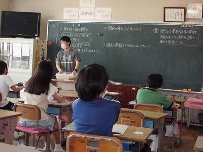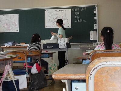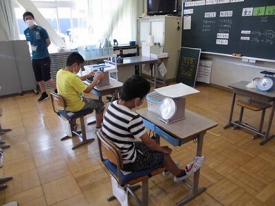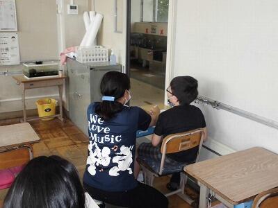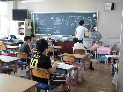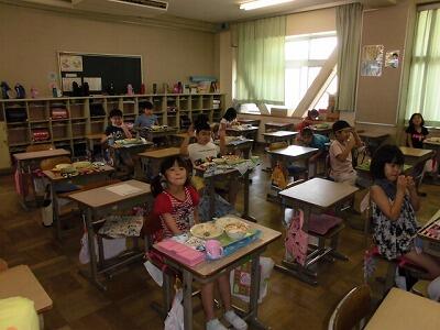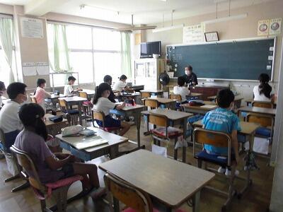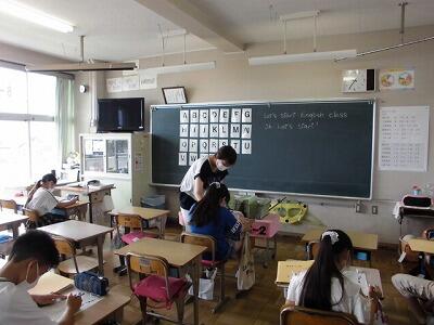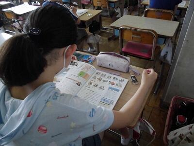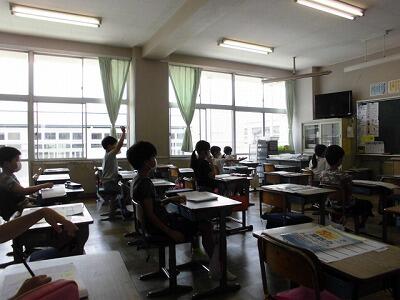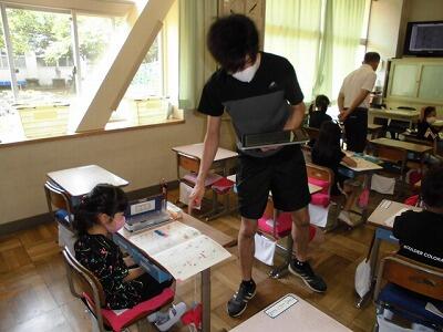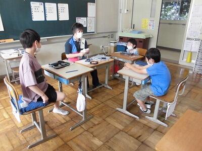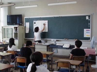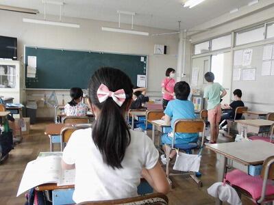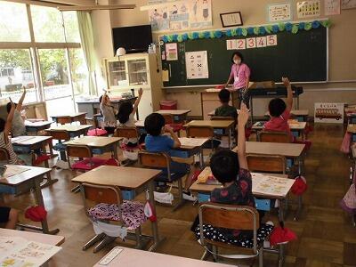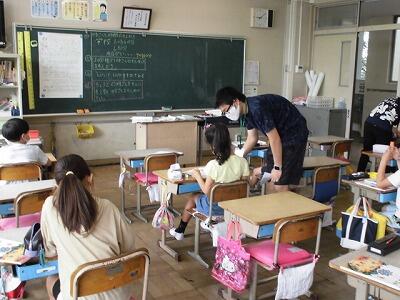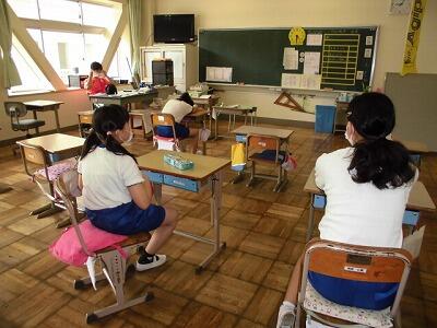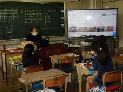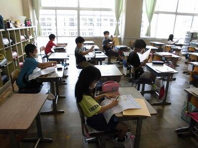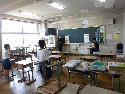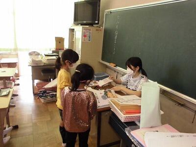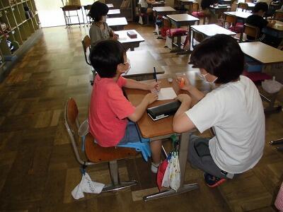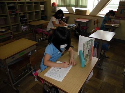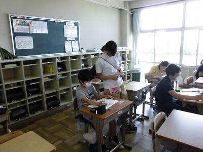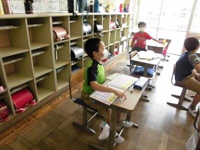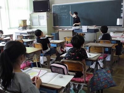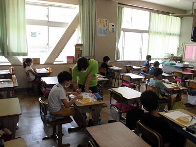 三,四年生は一斉に授業を行いながら、問題の確認を一人一人おこなったり、わからないところを一緒に確認したりしていました。分散登校で人数が半分のため、個別に指導できる時間があるという利点を生かして工夫した授業展開を行っています。