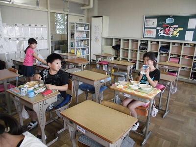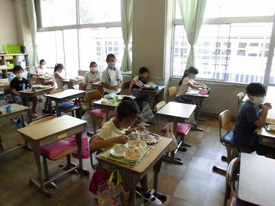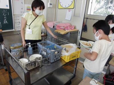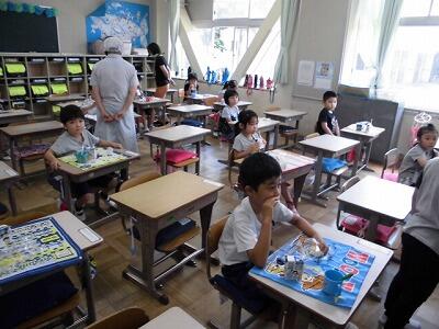 学校が再開してから2週間目になりました。今日、1年生のミニ給食でした。明日の給食に向けて、パンと牛乳を食べ、そのゴミの片付け方や給食の雰囲気を勉強しました。子ども達はおいしそうにしっかり食べ、片付け方もしっかりできました。明日から本格的に給食がはじまります。お話はできませんが、おいしい給食を食べて元気に生活していってほしいと思います。