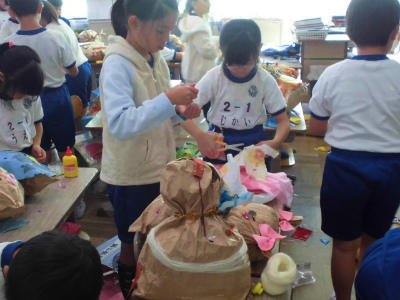 2年図工:「ぎゅっとしたいわたしの友だち」で、楽しそうに作品作りをしていました。