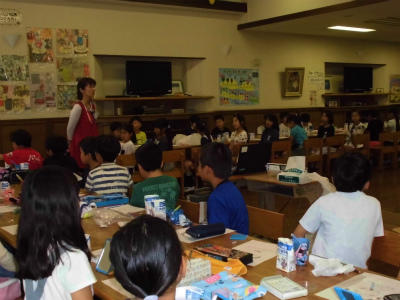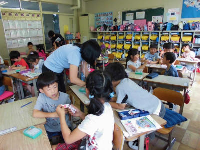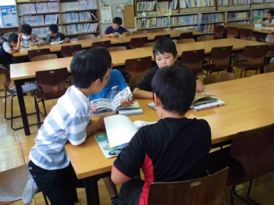 清掃はちょっとお休み。長い昼休みの時間は、小雨交じりでも校庭で賑やかに遊ぶ姿が見られます。図書室でも本に親しむ子どもたちの姿がありました。