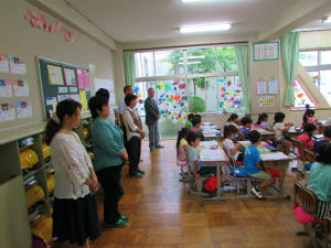 1年生もお話の会の皆さんを教室までご案内です。