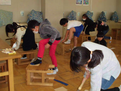 4年生 図画工作 真剣にのこぎりを使い、板を切ります。