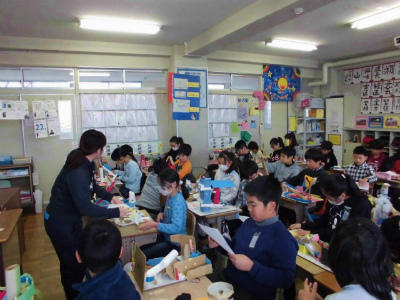 5年生図画工作 作品を鑑賞し合い、友だちからもらったコメントを読んでいます。