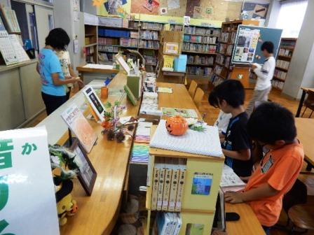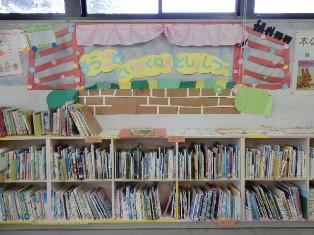こちらは管理棟の図書館です。業間休みに本を借りに来ている子どもたちです。