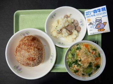 焼きカレーパン、ジャーマンポテト、えびとチンゲンサイのスープ、牛乳です。