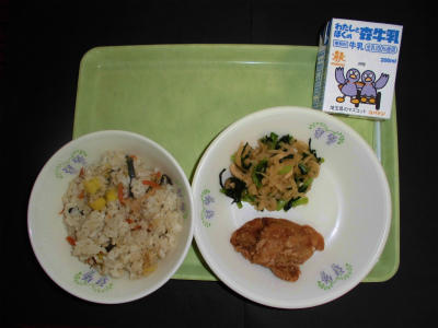 さつまいもごはん 牛乳 鶏肉の香り揚げ 煮びたし