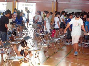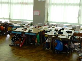 防災頭巾をかぶり、机を寄せてシェルターを作り、身を守ります。