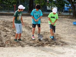 運動委員会の皆さんが砂場の砂を掘り起こしています。