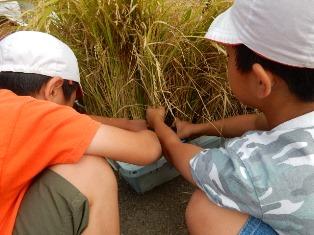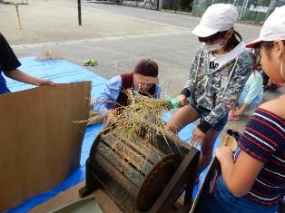 5年生が育ててきたバケツ稲、今日刈り取りをして脱穀しました。