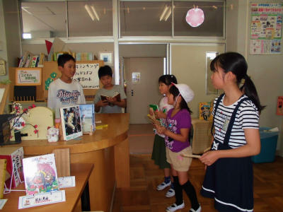 図書委員会の子どもが、本を返却したい子どものために手続きを行っています。