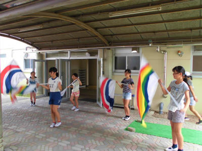 バトンクラブの子どもたちは、休み時間にもフラッグを回し自主練習に励んでいます。