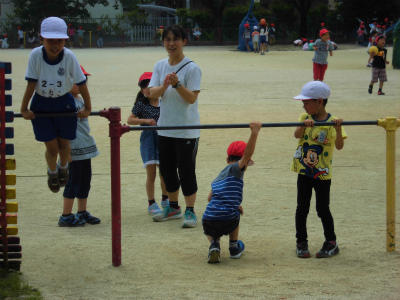 鉄棒で遊ぶ子ども、ドッジボールの練習をする子ども。校庭は一番活気づく時間です。