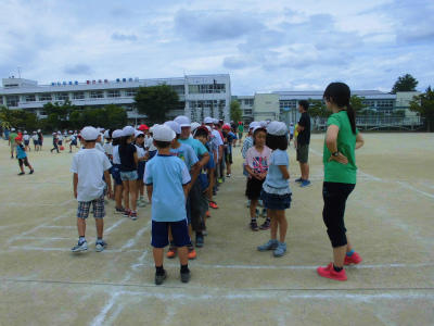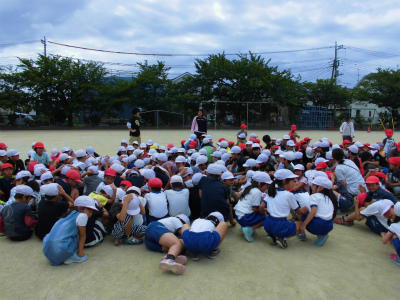 震度5強の地震発生を想定して、訓練を行いました。短時間で行う訓練ですが、子どもたちは校庭の中央で身を屈め、整列しました。校舎内にいた子どもたちも、身の安全を確保できました。