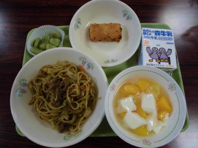 焼きそば 牛乳 いかのピリ辛焼き そら豆 フルーツ杏仁