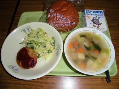 子どもパン、牛乳、ハンバーグ、グリーンサラダ 、まめまめスープ