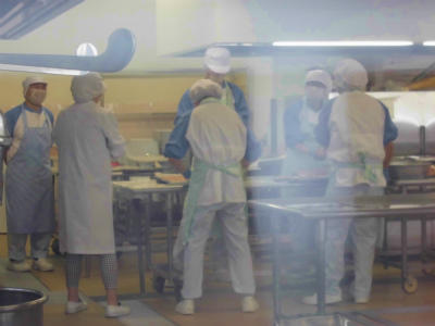 美味しい給食ができる前の給食室の様子です。調理員さん、忙しそうですね。