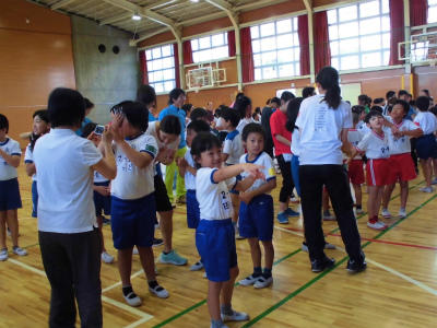 きょうは、春日部市内11校の小学校から、特別支援学級の子どもたちが豊春小学校の体育館に集合して、合同学習会(運動やゲーム、歌など)を行いました。