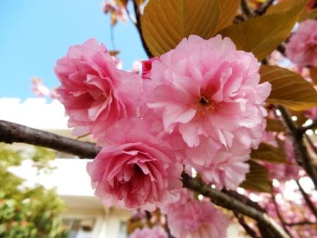 八重桜も満開になり、今日は風に花びらを散らしています。