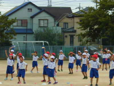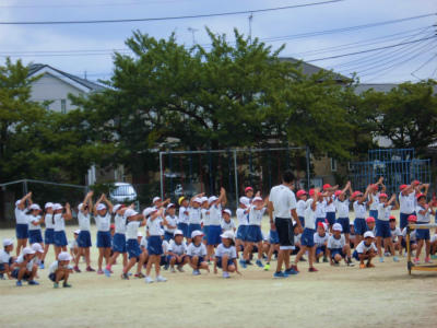 朝の全体練習、各学年の練習に全力で取り組む子どもたちです。ダンスや集団で行う体操の練習に力を入れています。