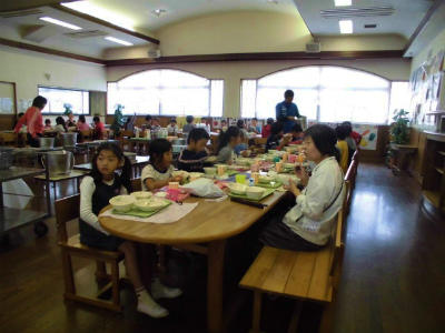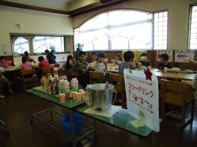 ランチルームで、3年生赤組が交流給食を楽しんでいます。フリードリンクの牛乳、コーヒー牛乳、ぶどうジュース、りんごジュースが人気です。