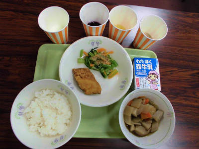 ごはん、牛乳、さばの竜田揚げ、小松菜のごま和え、芋煮