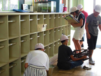 参加する子どもを確認しています。涼しいランチルームが学習の場所です。
