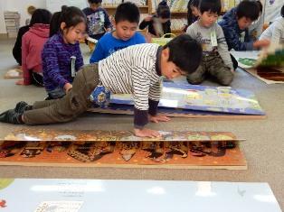 1年生が図書室で絵本を読んでいました。自分の身長より大きな