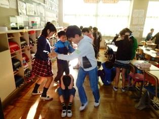 4年生はお楽しみ会で、真っ赤なほっぺの格好をして廊下で