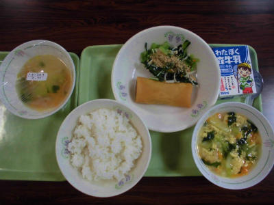 ごはん 牛乳 かぼちゃの包み揚げ 小松菜のナムル ちんげん菜のスープ