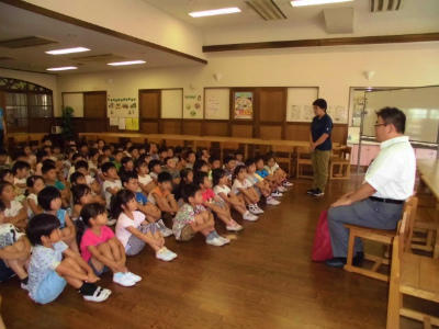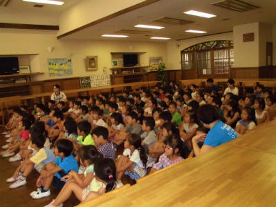 春日部警察署から警察官の方を先生としてお招きして、自分の命を守るお話を伺いました。不審者には要注意。声を出すことも大事です。また、「地域には、子どもの味方をしてくださるよい方もいらっしゃるよ。」とお話くださいました。1年生、しっかりした姿勢で話を聞いています。