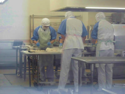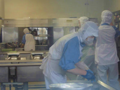 暑い夏には調理中の室温が30度以上になる給食室です。そのような中、調理員さんは身支度を整え、調理してくださいます。