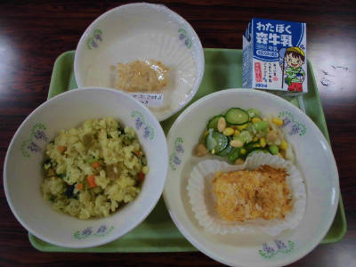 カレーピラフ、牛乳、いかのこんがり焼き、豆まめサラダ、除去食はチーズ・マヨネーズ・卵抜きのいかのこんがり焼き