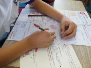 算数の授業では、テスト直しをしています。間違えたところを赤ペンで直します。