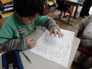 1年生は算数の授業で、時計の時刻を書き込んでいます。